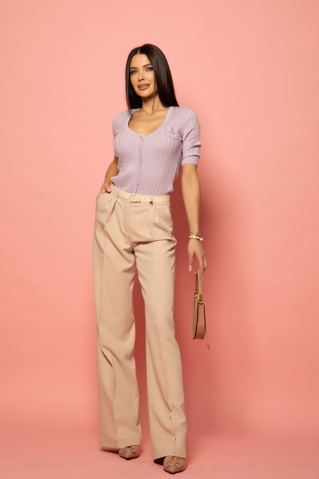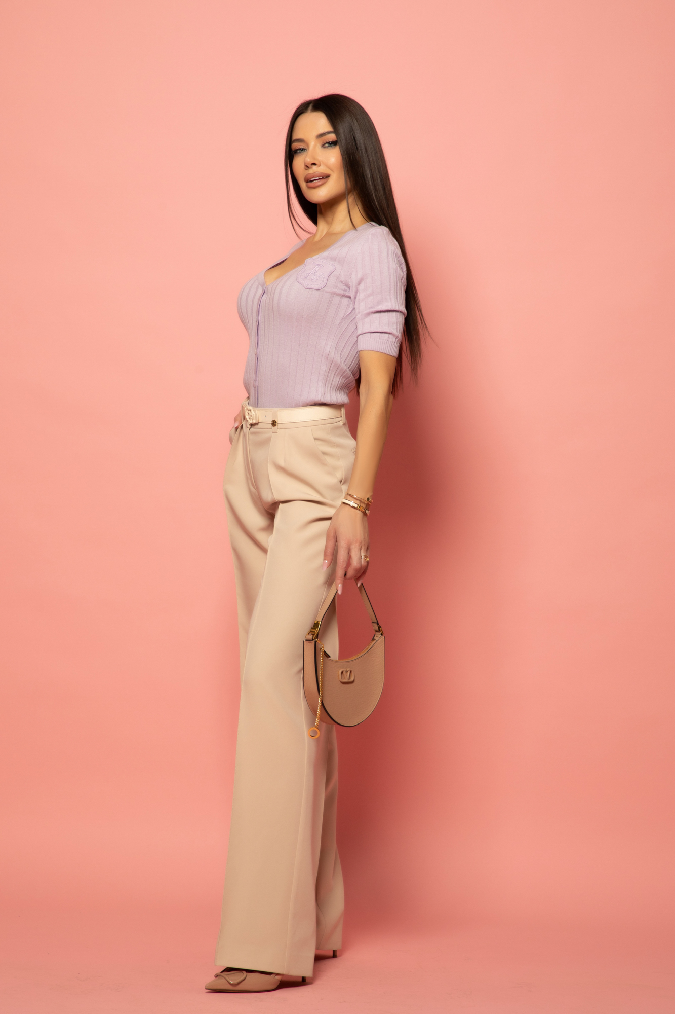 "Lavender knit that feels like a mood boost you can wear. Cotton V-neck, fitted just right, and a color so pretty it makes everything around it look better - including you. Not that you needed help. 💜"